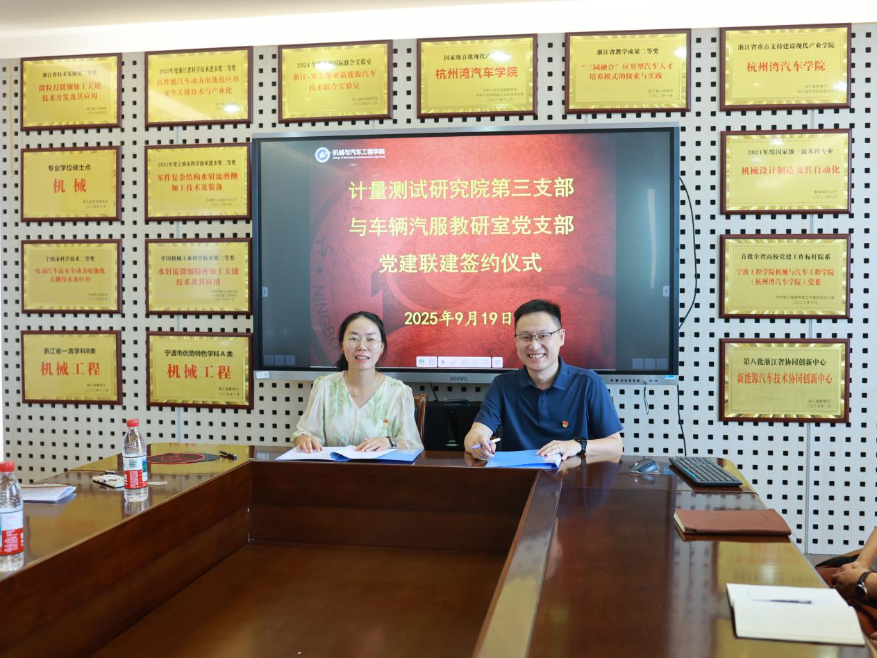 为深入推进基层党组织建设,创新党建工作模式,促进党建与业务深度融合,9月19日,宁波市计量测试研究院第三党支部与机械与汽车工程学院车辆汽服教研室党支部在图书馆601会议室隆重举行党建联建签约仪式。副院长余丰、双方党支部书记、党员代表及学院组织员出席了本次活动。