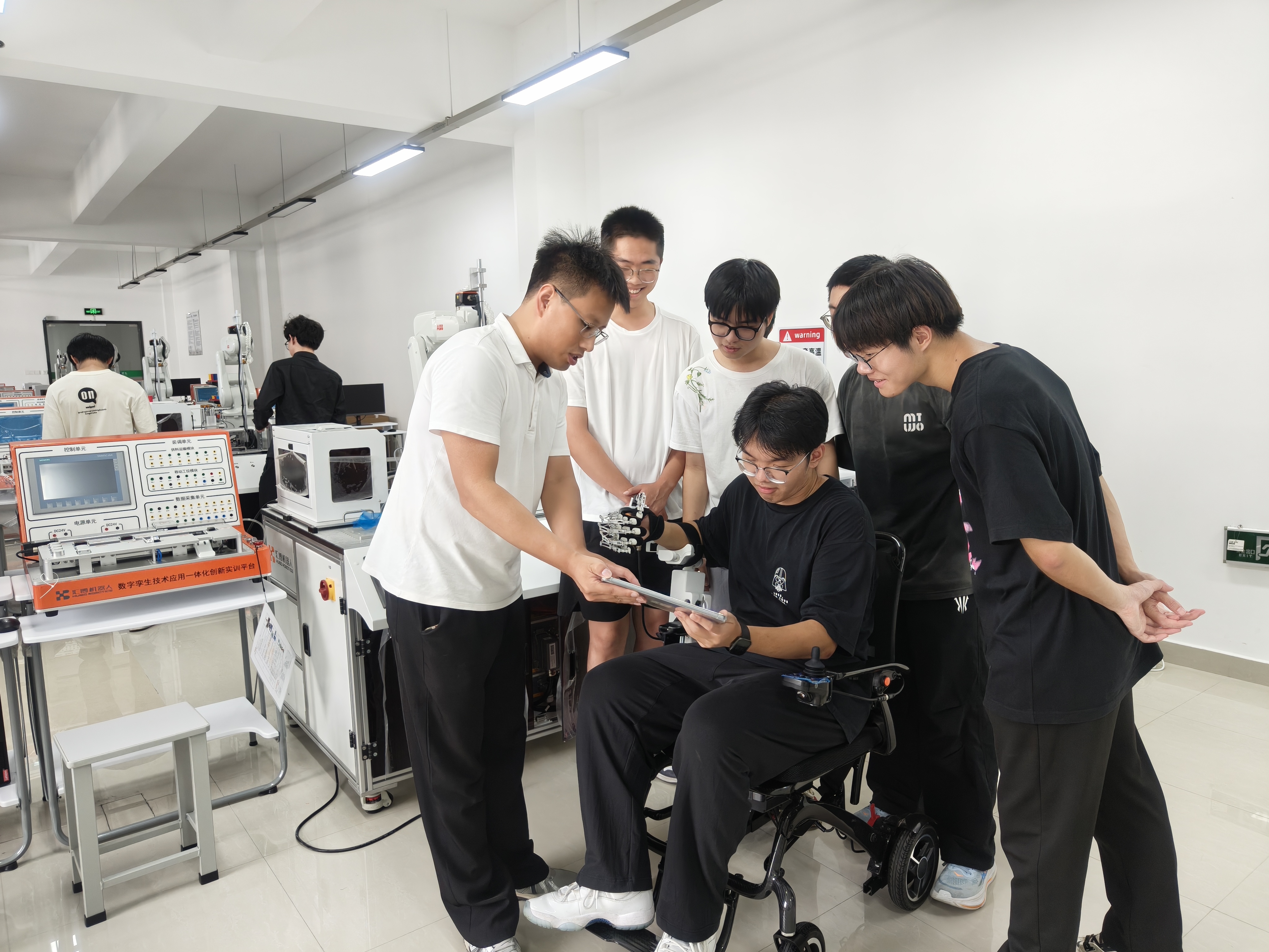 于金须(前排左一)与学生们在试验脑机接口康复设备。吴正彬摄